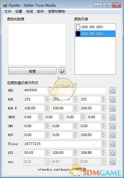 3、取色成功后,罗列出RGB、CMY、CMYK、HSV、TColor和XYZ0数值,方便用户调用;